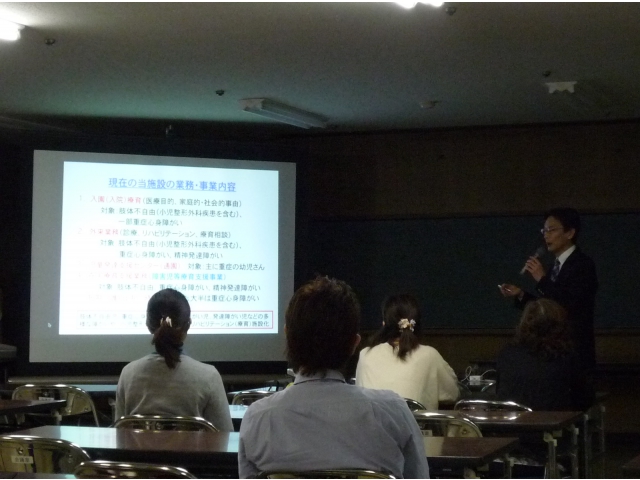 保護者の皆さんとの懇談会では、園長が園の概要について説明を行い、その後、訓練課、看護部、指導課の職員から園での生活についての説明をさせていただきました。