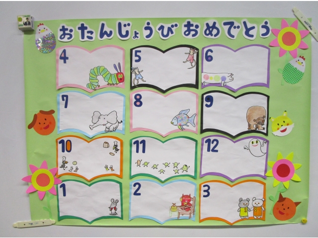 作品にはみんなの誕生月ごとに誕生日を書き入れてみんなの見える所に掲示しています。実習生の皆さんありがとうございました!