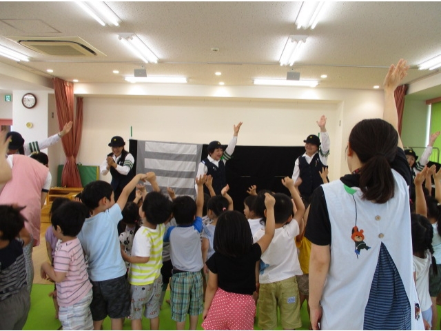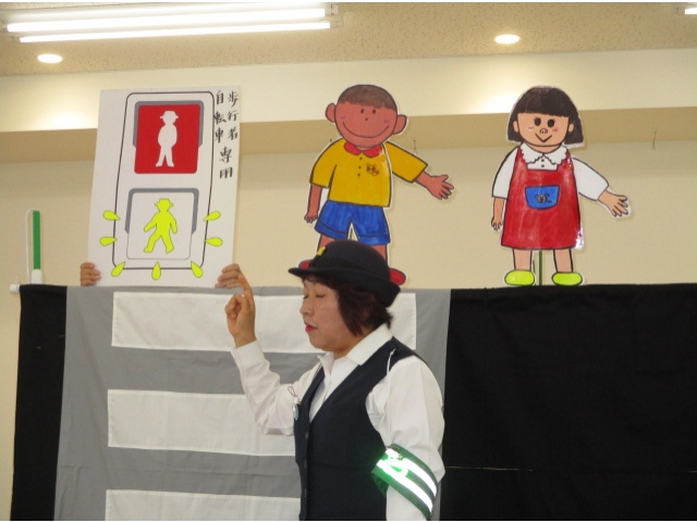 手あそび歌から始まり、右・右どっちなどのペープサートを見て、交通ルールを分かりやすく知ることができて子ども達は興味津々で話を聞くことができました