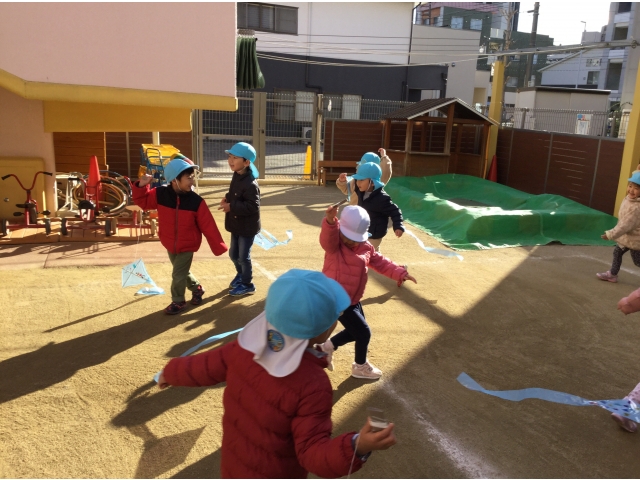 外は寒かったですが自分の作った凧が高く上がると大喜び!たくさん走ってとても元気いっぱいなお友だちでした。