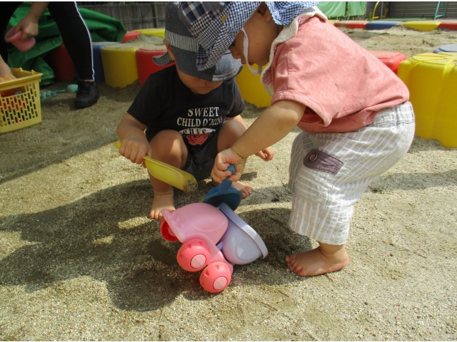 「ぶーぶー」と車を並べたり、砂を乗せて走らせています。