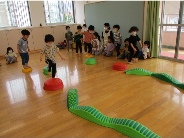 跳び箱を飛んだり、トンネルをくぐったり、グネグネの一本橋を通ったりして遊びました☆
