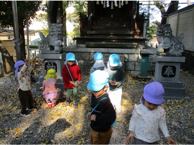 過ごしやすい快晴の天気の中、3~5歳児で七五三参りに行きました。落ち葉拾いのポシェットを肩に掛け、お友だちと手をつなぎ、六所社まで歩きました! お友だちや先生と会話をしながら、元気よく歩いて行くことができました!