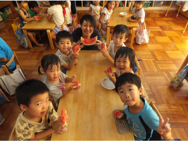 皆で割ったスイカは格別に美味しかったようで、嬉しそうに頬張っていました(8分音符)