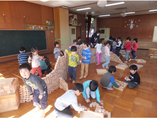 4歳児きりん組と、5歳児ぞう組がそれぞれ積み木ワークをし、展示しました(8分音符)
