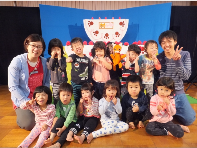 2歳児はストーリーをしっかり理解し、笑ったり、お話ししたり、手拍子したり、踊ったりと全身で楽しんでいました。担任と目を合わせて楽しみを共有する姿もありました。