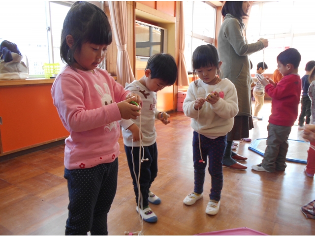 3歳児は自分でひもを巻くのが難しいので、巻いてもらったこまを一緒にまわしてみました。まわると喜びよりもびっくり顔の子が多く、かわいかったです。