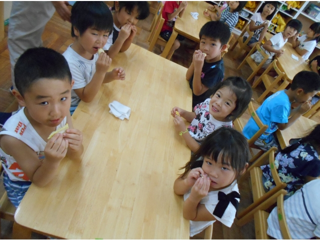 小さく切ったとうもろこしでしたが、「いいにおい!」「とうもろこしの味がする」「色はうすい」「甘いねー」と感想を言いながらあっという間に食べてしまいました。