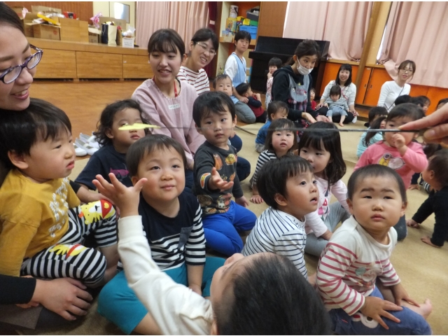 0・1歳児の子どもたちもとても集中して観ることができました。指差ししたり、笑ったり、どんどん舞台に近付いたり、ちょっぴり怖くて先生にくっつきながら観たりとそれぞれの姿がありました。