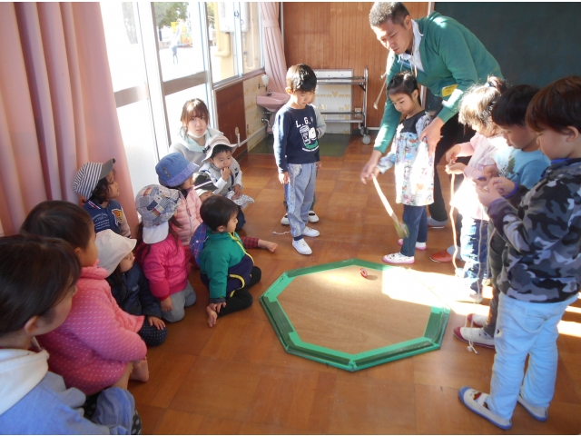 今年も、学童の指導員をしている保護者の方のご厚意で幼児クラスの子どもたちにこまの回し方を教えていただくこま大会を行いました。