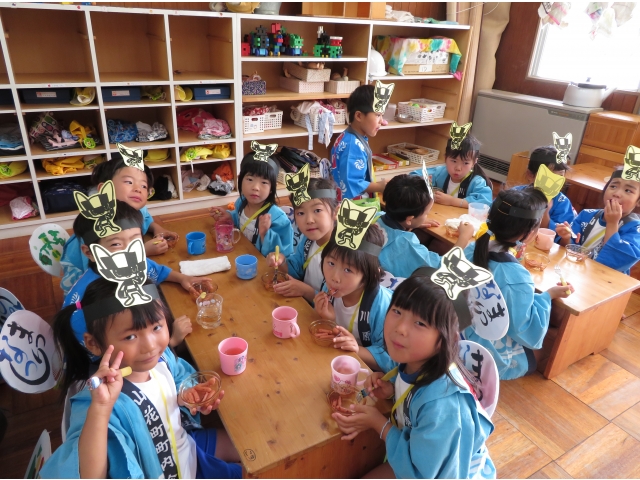幼児クラスの子どもたちは自分で描いたうちわを持って参加です。
