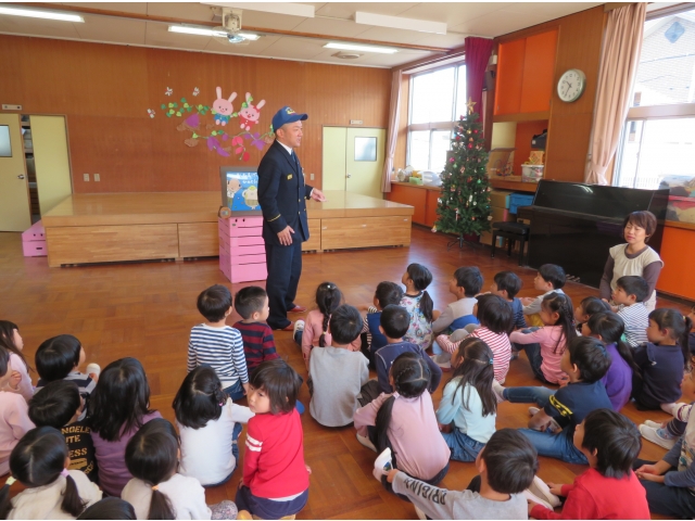 昭和消防署の消防士さん2人が遊戯室で紙芝居をみせてくれました。夏におもちゃ花火に来てくれた消防士さんを覚えていて、最初から大喜びの子どもたちです。