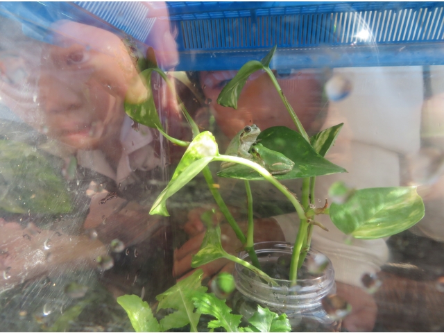 お弁当を食べ、グランドで遊ばせてもらいましたが、その時にカエルを発見!どうしてもと言うので、4匹持ち帰り年長さんが育てています。