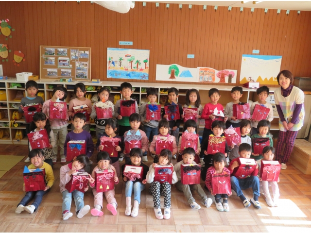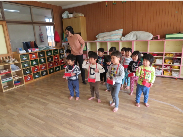 節分の日に、5歳児のお友だちがオニになって乳児の部屋へきてくれました。