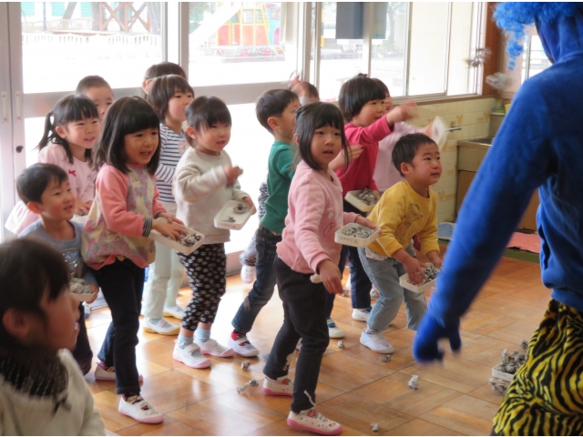 自分の中にいる“おこりんぼうオニ”“なきむしオニ”“いじわるオニ”“いやいやオニ”などいろいろなオニを追い出してもらうため、今年もあかオニ、あおオニが保育園へきました!
