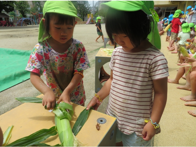 5歳児のぞう組さんが、畑で育てていたとうもろこしを収穫しました。2人で1本ずつとります。力を合わせて引っ張っていました。