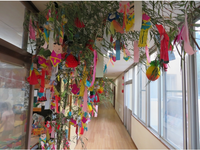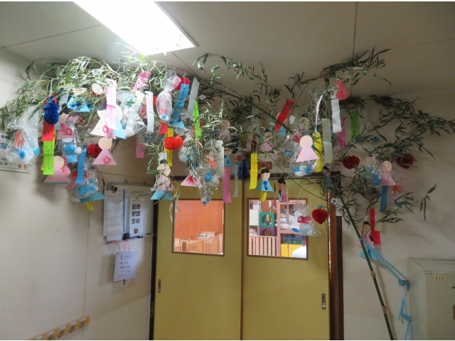 子どもたちが作った七夕飾りとお家の人と願い事を書いた短冊を笹に飾りつけました。