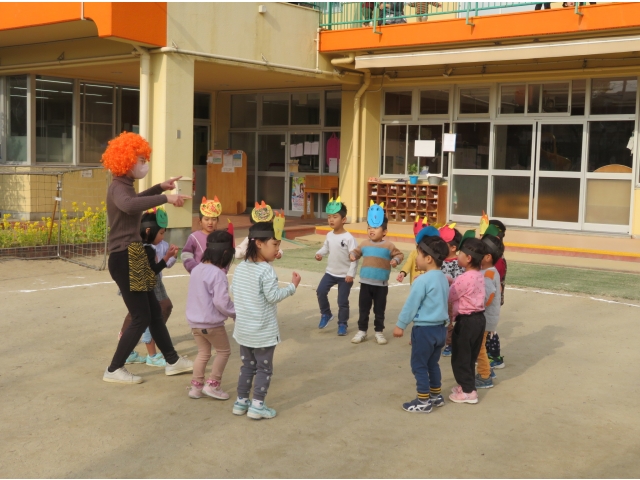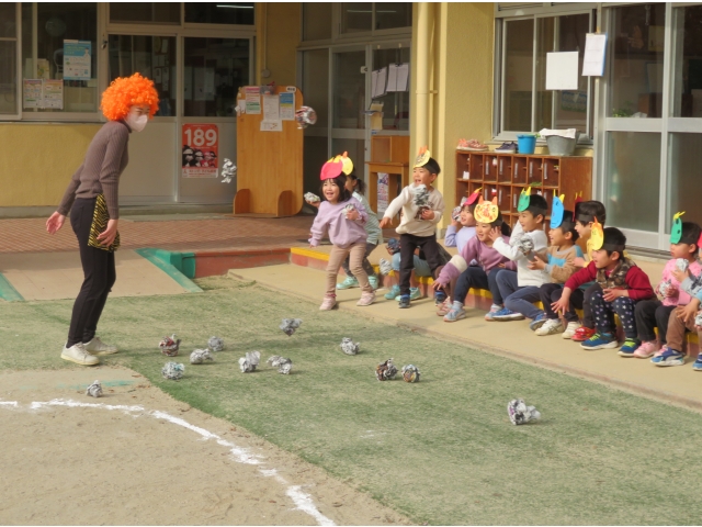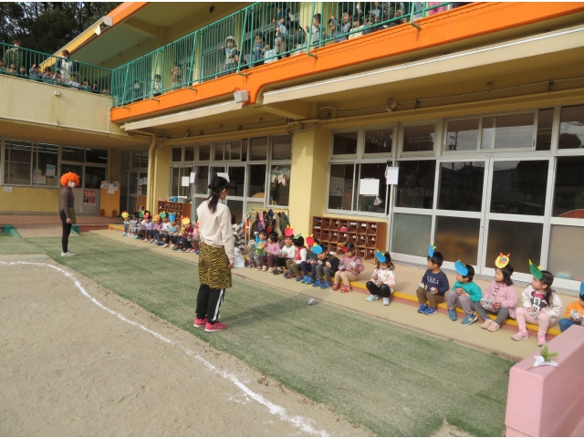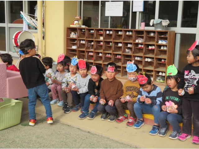 2月3日は節分! 自分達で作ったオニのお面をかぶり、園庭に出てみんなで自分の心の中にいる泣き虫オニ!、怒りんぼうオニ!、いやいやオニ!いじわるオニ!などをやっつけました。