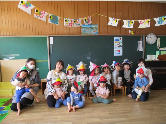 水色、ピンク、黄色を使ってかわいいこいのぼりができました!部屋を泳ぐこいのぼりを見て「あれ○○ちゃんの!」と指を指して喜んでいました!