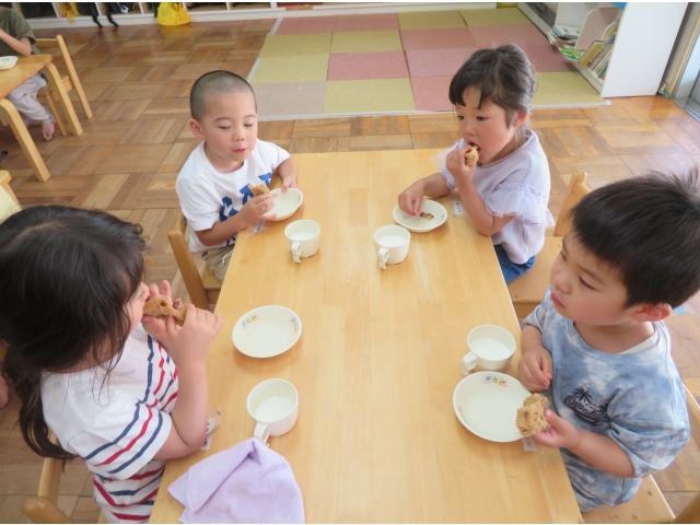 おやつの時間を楽しみにしており、お昼寝の後には「今日のおやつはなに?」と保育者に聞いています。