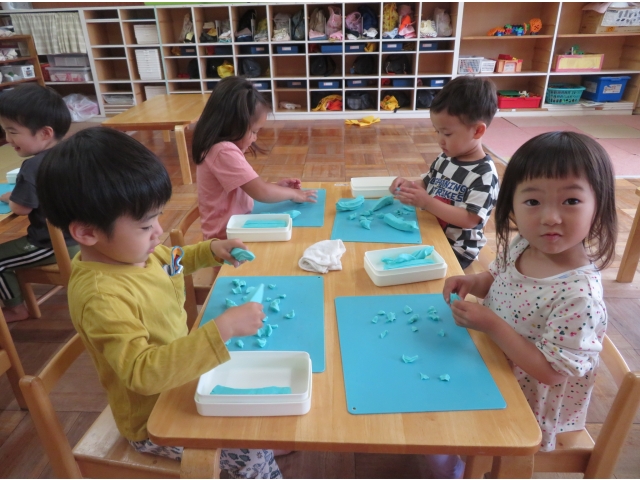 保育園で初めて粘土で遊びました!自分だけの粘土が嬉しかったようで、それぞれ色んな形を作って楽しんでいましたよ♪
