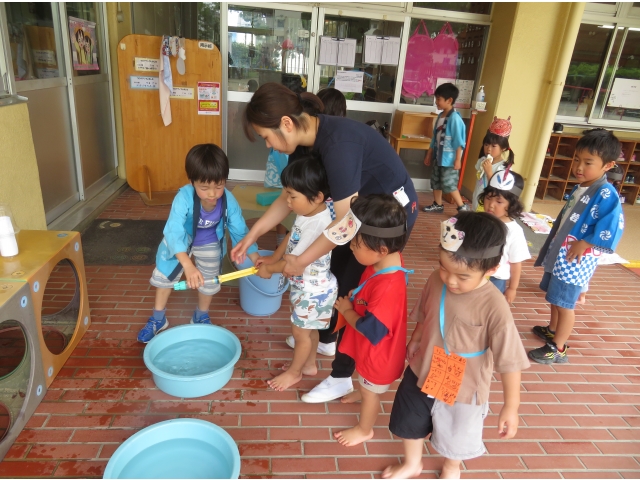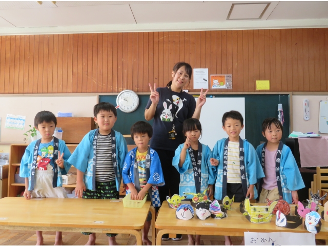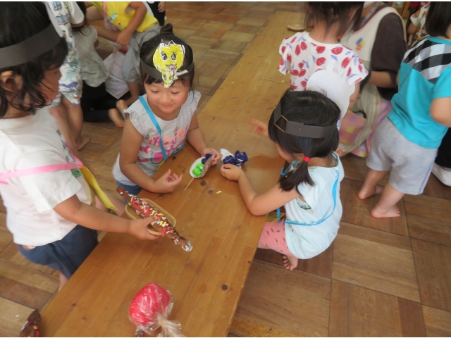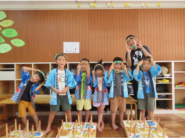 なつまつりに向けて、5歳児が中心となり、お店屋さんで使う食べ物やゲーム等考えて作たり、当日に着るティシャツ染めをしたり、盆踊りで踊る踊りを覚えたりし準備をすすめてきました。