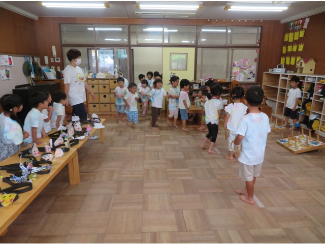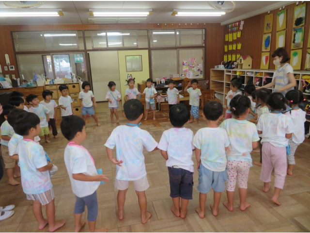 2日目のなつまつりは、ぞう組、きりん組のお友だちが作ったTシャツ染め手作りの服を着て行いました。