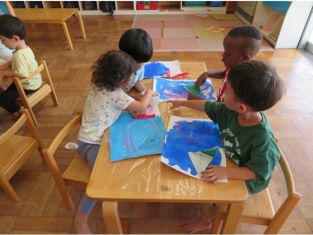 海にはどんな生き物がいるのか、何があるのか考えながら製作していました♪