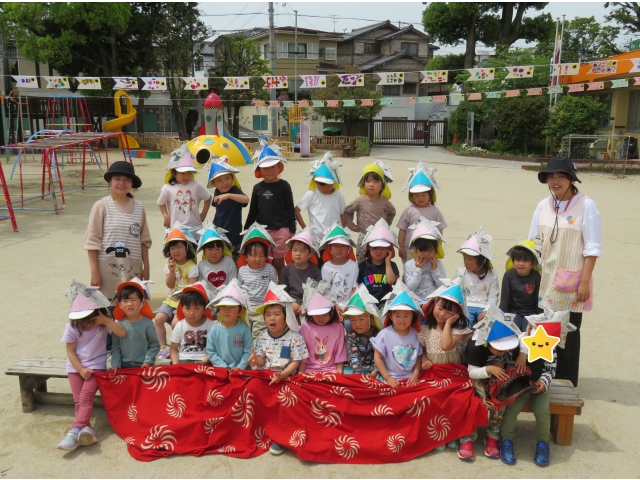 3歳児のお友だちは5歳児さんからもらった手作りかぶと、4.5歳児のお友だちは自分で作ったかぶとをかぶり楽しみました♪