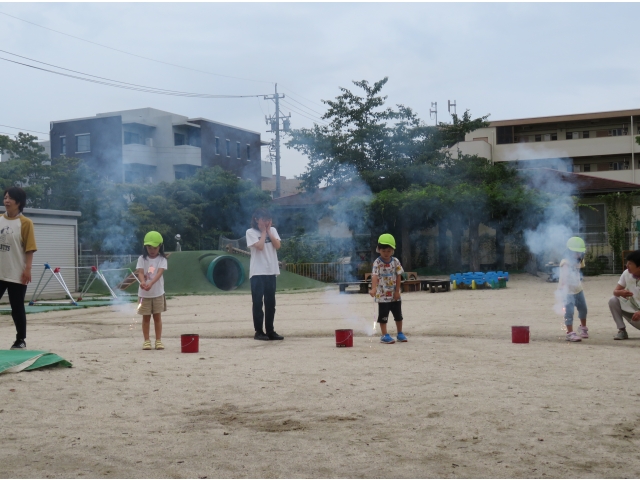 先日、昭和区消防署員の方が、手持ち花火のやり方をぞう組のお友だちに教えに来て下さいました。