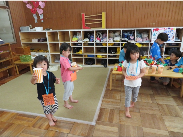 なつまつり2日目は、5歳児のお友だちがお店屋さんになって2.3歳児のお友だちをおもてなししました。