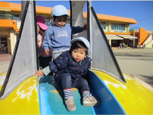 冬の寒さにも負けず、元気いっぱいお外で遊んでいるひよこ組のみんなです。