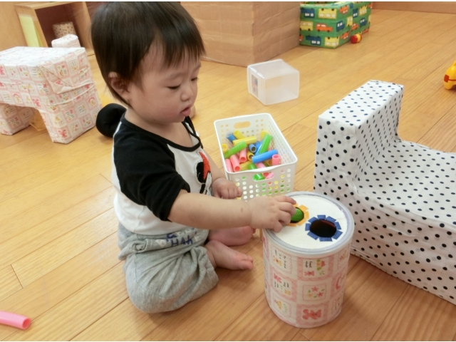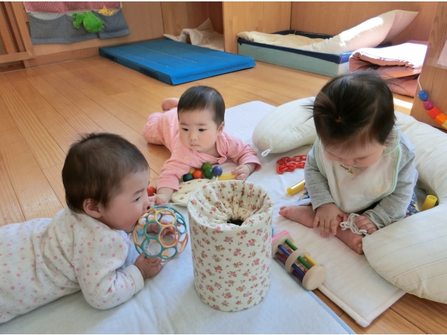 今では、少しづつ環境や保育者にも慣れ、気になる玩具に手を伸ばしたり、あやすと“キャッキャッ”と笑ったり、笑顔で過ごす日が多くなってきました!(^^)!