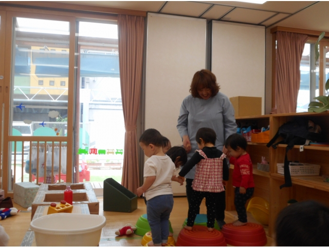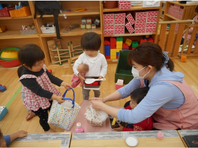 子ども達の部屋の様子はお弁当箱にチェーンのおもちゃを詰めて食べる真似をしたり、あかちゃんの人形をおんぶして部屋を散歩したりしています。牛乳パックで作った手押し車を押して「ぴあごにい~く」と言ってお買い物ごっこする子もいてみんな思いおもいに楽しく遊んでいます。(^^)