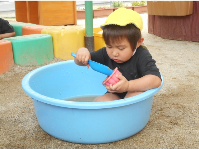 「おんせん~」と言ってたらいに入る子、「カレーです!コーヒーです!」と言って茶色い食べ物に見立てている子もいました。