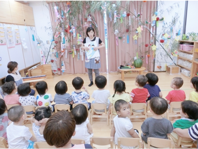園長先生から七夕の話を真剣に聞いていた子どもたち。お供えの夏野菜をじっくり見て「きゅうり!」「なす!」「コーン!」「トマト!」「すいかー!」と知っている野菜の名前を言ってくれていましたよ('ω')ノ