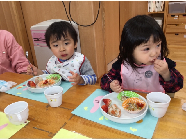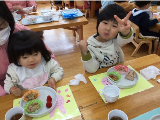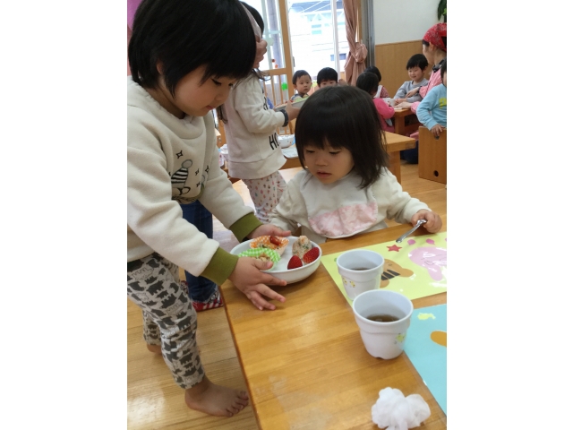 その後、うさぎ組さんがプレートを配ってくれました!丁寧に優しく置けていましたよ!