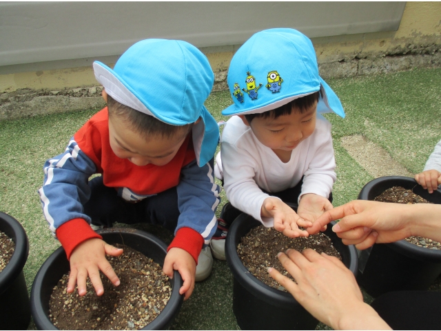 ひまわりの種は子ども達一人ひとりの自分のマークの鉢に植えました。