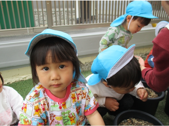 「おおきくなあれ」「おいしくなーれ」と植えた後子ども達と水やりをしました。「これからも野菜、ひまわりがおおきくなるようにみずをあげてね」と言うと「はーい(^O^)」と嬉しそうに返事をしてくれました。自分達で育て収穫した野菜を食べれれる日が来るのが楽しみです。(#^^#)
