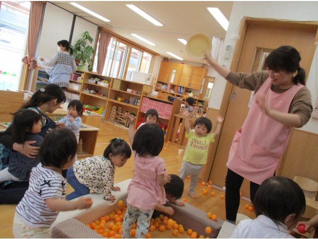 お皿やバケツに、ピンポン玉を集めると、子ども達自らジャーとする子もいれば、ピンポン玉をポーイと投げる子、自分の服の中にピンポン玉を入れる子、ボールプールの中にダイブする子…様々な遊びを楽しむ子どもたちでした!(^^)!
