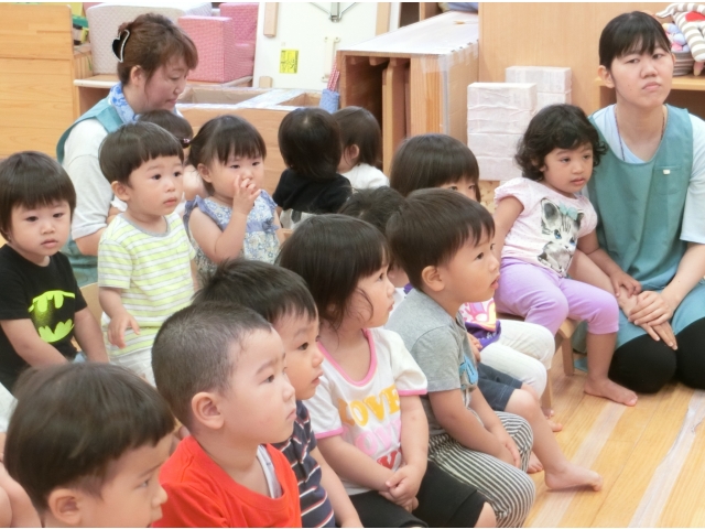 まずは、園長先生から七夕についての話を聞きました。可愛い織姫と彦星も登場し、子ども達は真剣な表情で話を聞いていました('_')
