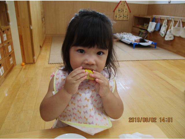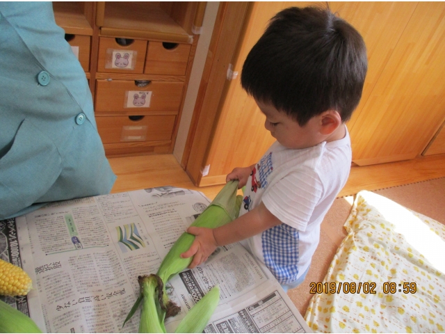 子ども達は、皮つきのとうもろこしを見ても、まだ何かはハッキリと分かっておらず、保育者が1本見本で皮をむくと、中から出てきたものを見て、「あっ!コーン!!」と大喜びしていました☆