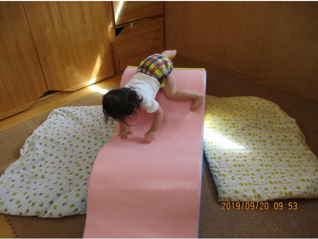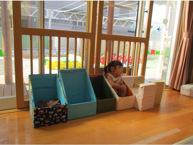 室内では、被り物を被ったり、ブロックを組み立てて電車などを作ったり…ウレタンマットで体を動かして遊ぶ子もいます(#^^#)