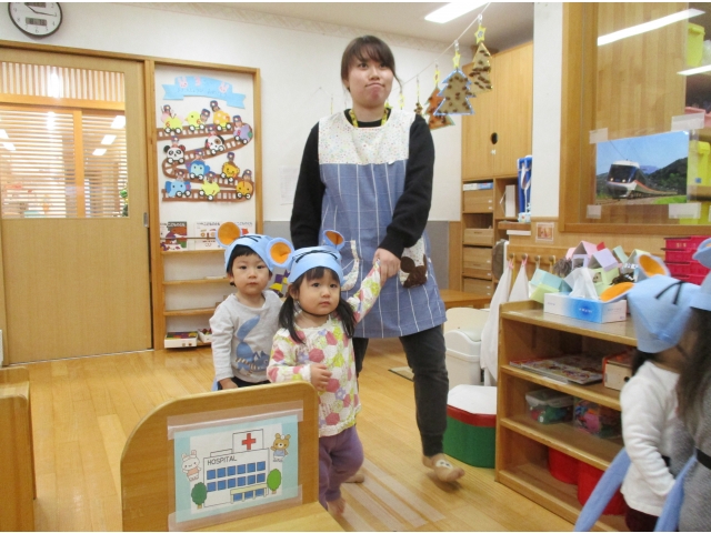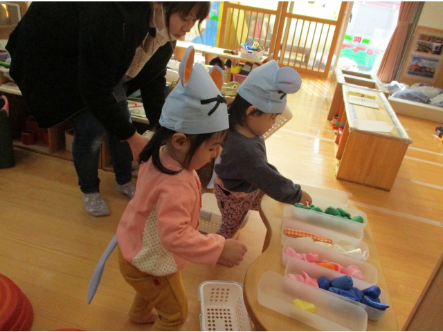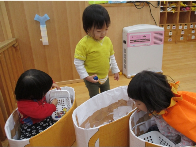 クリスマス会が終わった後も、ネズミのお家や鍋をあそびの中で出すと、大喜びしてお家の中に入ったり、自分から鍋の中に入ったり…また、変身グッズとして、たくさんの手作り衣装を新しく出すと、早速見つけ、身につけては鏡の前で、にやにやする子もいました(*^-^*)