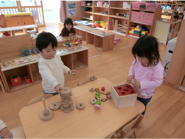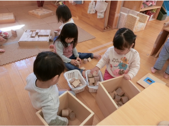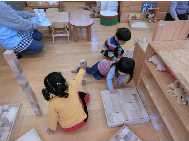 今日は、うさぎ組とりす組の室内を両方使い、積み木遊びを行いました。どちらの室内でも遊べるため、子ども達は好きなところを選び、積み木遊びを楽しんでいました!(^^)!また、うさぎ組のお兄さんお姉さんが、りす組の子と一緒に遊ぶ姿もあり、りす組の子ども達も、とっても嬉しそうに遊んでいました!(^^)!
