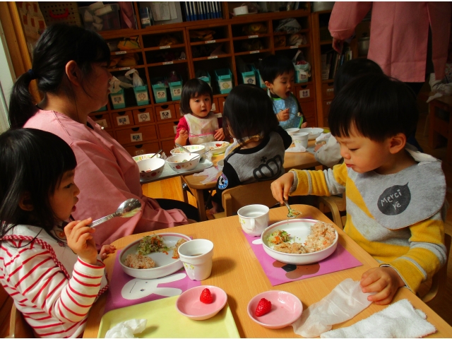 うさぎ組さんとりす組さんが同じテーブルで一緒に「いただきます」をして食べ始めました。「みんなでおいしいね」と話をして交流を楽しんでいました。