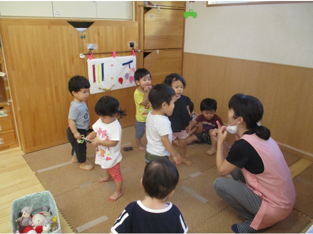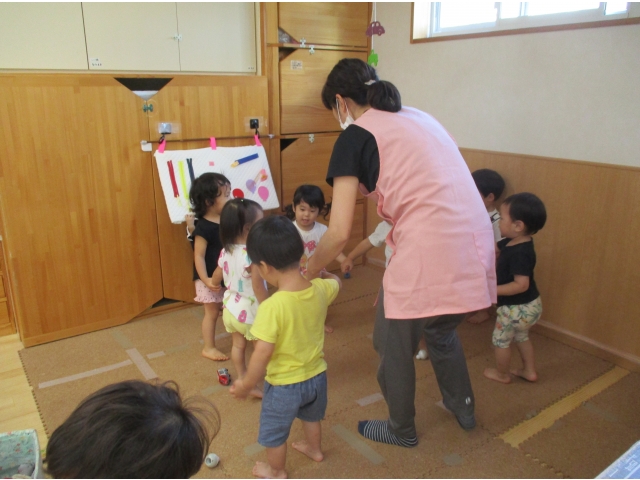保育者と一緒に楽しく歌をうたい、友だち同士手を繋いで楽しんでいます。