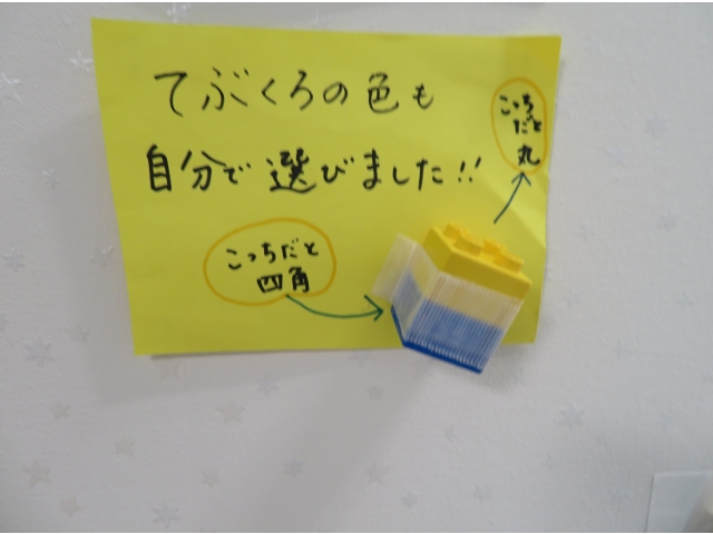 りす組(1才児)は、サインペンでの自由画や、普段おもちゃとして遊んでいるレゴデュプロを使ってスタンプをして、素敵な手袋を作りました♪