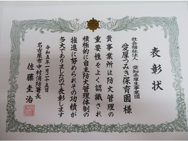 - 積極的に自主防火管理体制の推進に努めているということで、消防署から表彰をうけました
