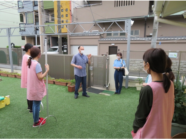 園庭遊び中に不審者が盗撮しているという想定で訓練を行い、今回は初めて中村警察署の方に犯人役をやって頂き、緊張感のある中での訓練でした。